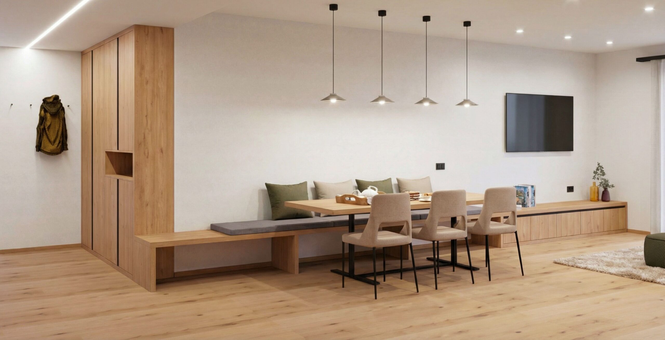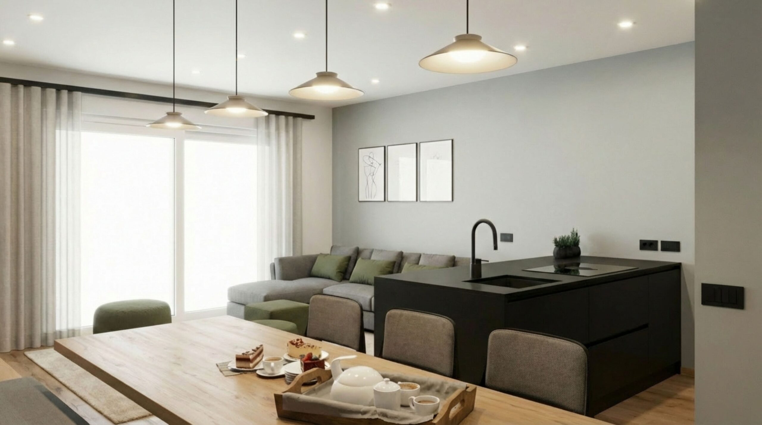 La cucina diventa un elemento architettonico, integrato e discreto, mentre il soggiorno è costruito attorno al comfort e alla funzionalità.